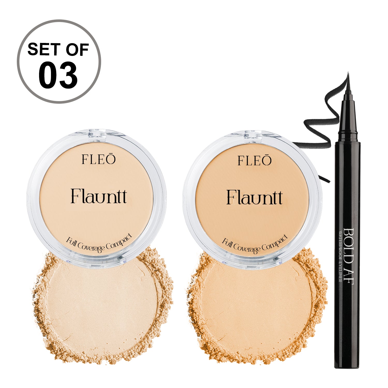 Flauntt Full Coverage Compact Shade- Natural 01, BEIGE 03 & Bold AF Waterproof Eyeliner
